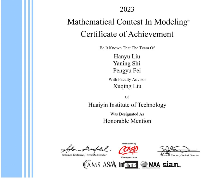 近日,2023年美国老员工数学建模竞赛结果揭晓,公司数理学院刘绪庆、王小才指导的精英班刘涵裕、费鹏宇、侍雅宁团队和精英班杨宗政、杨靖楠、王翔云团队荣获国际二等奖2项(Honorable Mention)。
