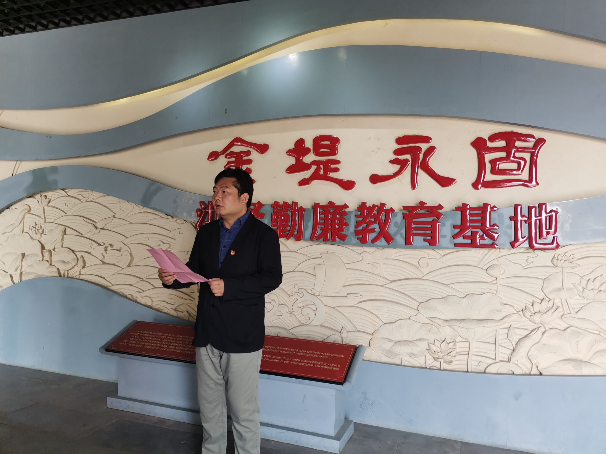 “金堤永固”勤廉教育基地以“水能载舟,亦能覆舟”为主线,以“蚁穴溃堤”为警示,设有水乡春秋、治淮润泽、蚁穴溃堤、正风肃纪、警钟长鸣五个专题展厅,主要介绍了洪泽湖水系及周边重要的水利工程,大禹、陈登、靳辅、郭大昌、林则徐等治水名人以及建国后党员干部贪污腐败违纪违法的真实案例和犯案人员的忏悔书。
