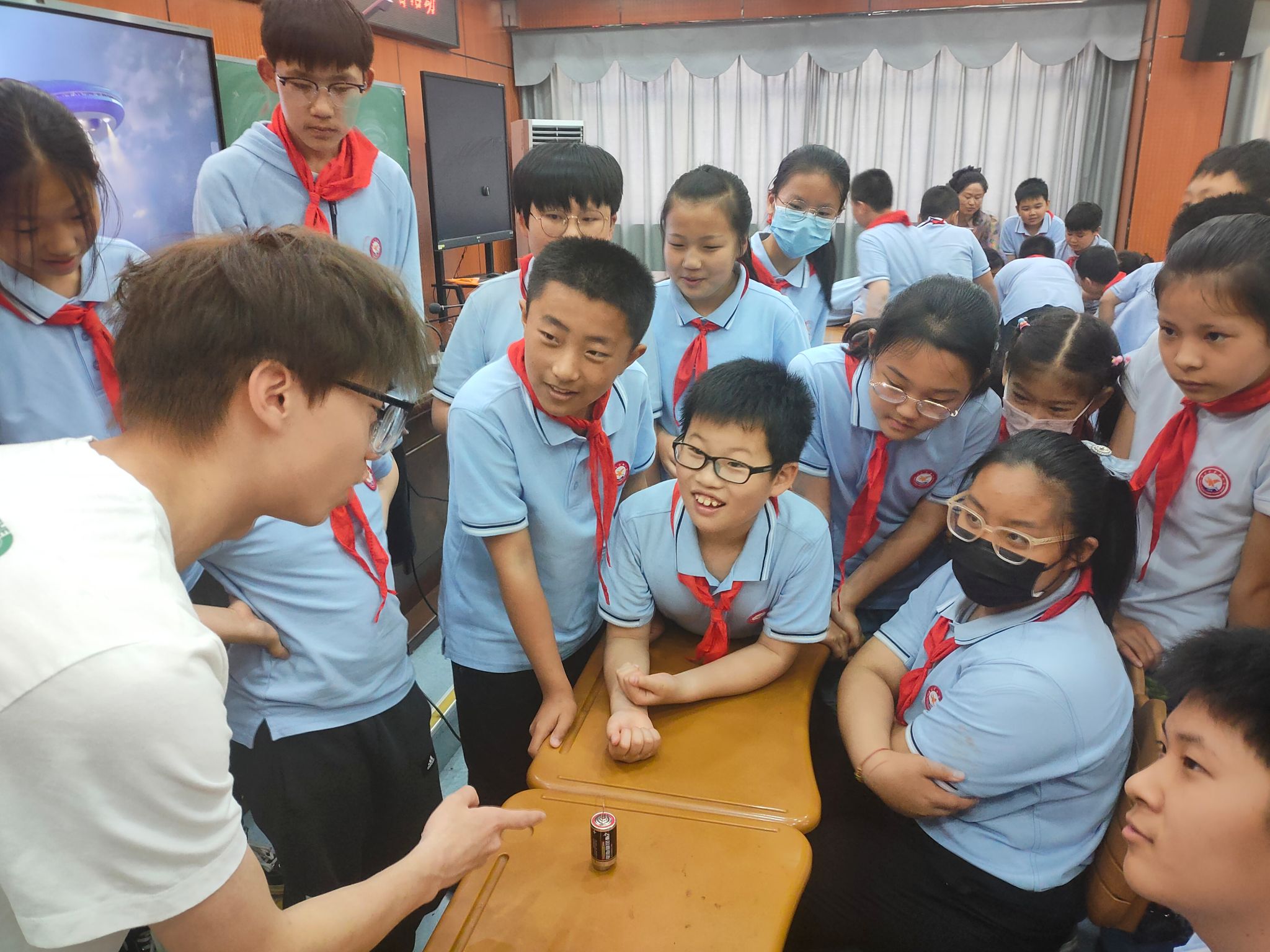 随后,学院的五个团队分别演示了《跟着柯南学化学——趣谈变色反应》《吃不饱的水杯》《趣味单片机》《火山爆发实验》《电磁驱动——让铜线飞速转动的奥秘》五个小实验,以科技演示和现场体验等多种形式,展示了化学、物理、人工智能等知识。一个个生动有趣的科学实验,深深吸引着孩子们的眼球,他们情不自禁地发出阵阵掌声和惊呼声。同学们在介绍有关知识的同时,还讲述了相关的科学家在勇攀科研高峰时遇到的艰难挑战、光辉事迹以及所展现的优秀品格,孩子们纷纷表示要弘扬科学精神、传播科学思想、普及科学知识,努力争做一个科学知识的宣传者、科技发展的推动者、科技创新的实践者。