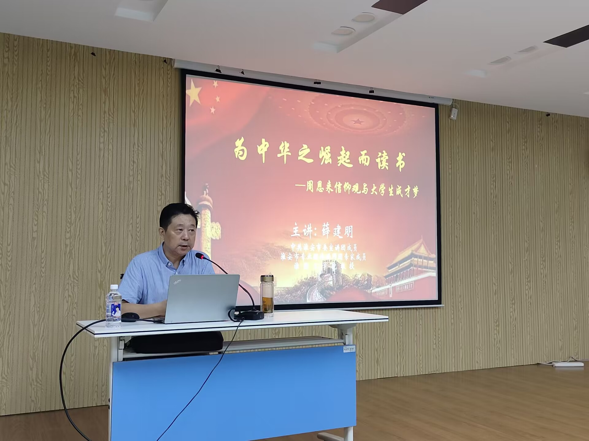 薛建明教授围绕“为中华之崛起而读书”的淮工校训,以“周恩来信仰观与老员工成才梦”为主题,对新生进行了一次爱党爱国,维护国家统一,党的民族宗教理论等方面的宣传教育,进一步增进青年员工对党的创新理论的政治认同、思想认同、理论认同、情感认同。他号召同学们像周恩来那样有坚定的理想信念、强烈的爱国热情、高尚的道德情操和勤奋的学习态度,努力拼搏、勤勉致知,积极为实现第二个百年奋斗目标和中华民族伟大复兴的中国梦贡献智慧和力量!