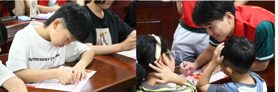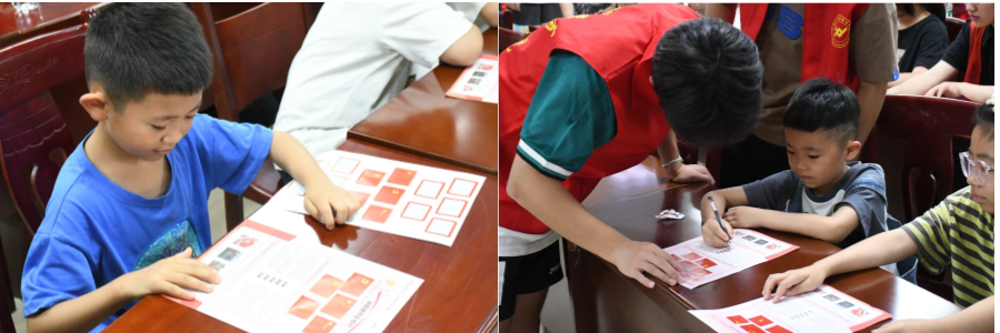 故事连心,情感升华。为了加深孩子们对五面旗帜的理解和情感认同,志愿服务团队还精心准备了一系列与旗帜相关的故事。孩子们在学习单上连线旗帜与其背后的故事,仿佛穿越时空,亲身参与了那些激动人心的历史瞬间。在这个过程中,他们对祖国的热爱之情得到了进一步的升华。