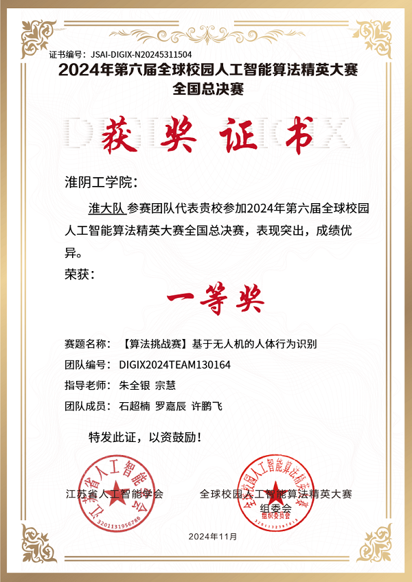 近日,第六届全球校园人工智能算法精英大赛全国总决赛圆满落幕。公司计算机与软件工程学院员工石超楠、罗嘉辰、许鹏飞在朱全银、宗慧老师的指导下荣获“算法挑战赛——基于无人机的人体行为识别”赛道国赛一等奖,省内仅有3家高校队伍获得国赛一等奖。此前,公司在省赛中获二等奖2项、三等奖8项、优秀奖4项。