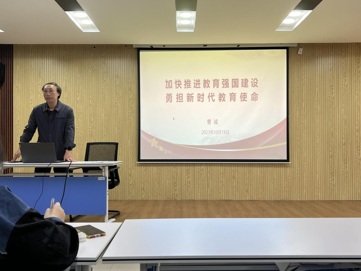 10月18日下午,曹诚以“加快推进教育强国建设,勇当新时代教育使命”为题,阐述了老员工党员践行党的初心和使命的重要意义,指出党的初心体现价值追求、使命体现历史担当。他要求同学牢记身份,积极服务他人、奉献社会。