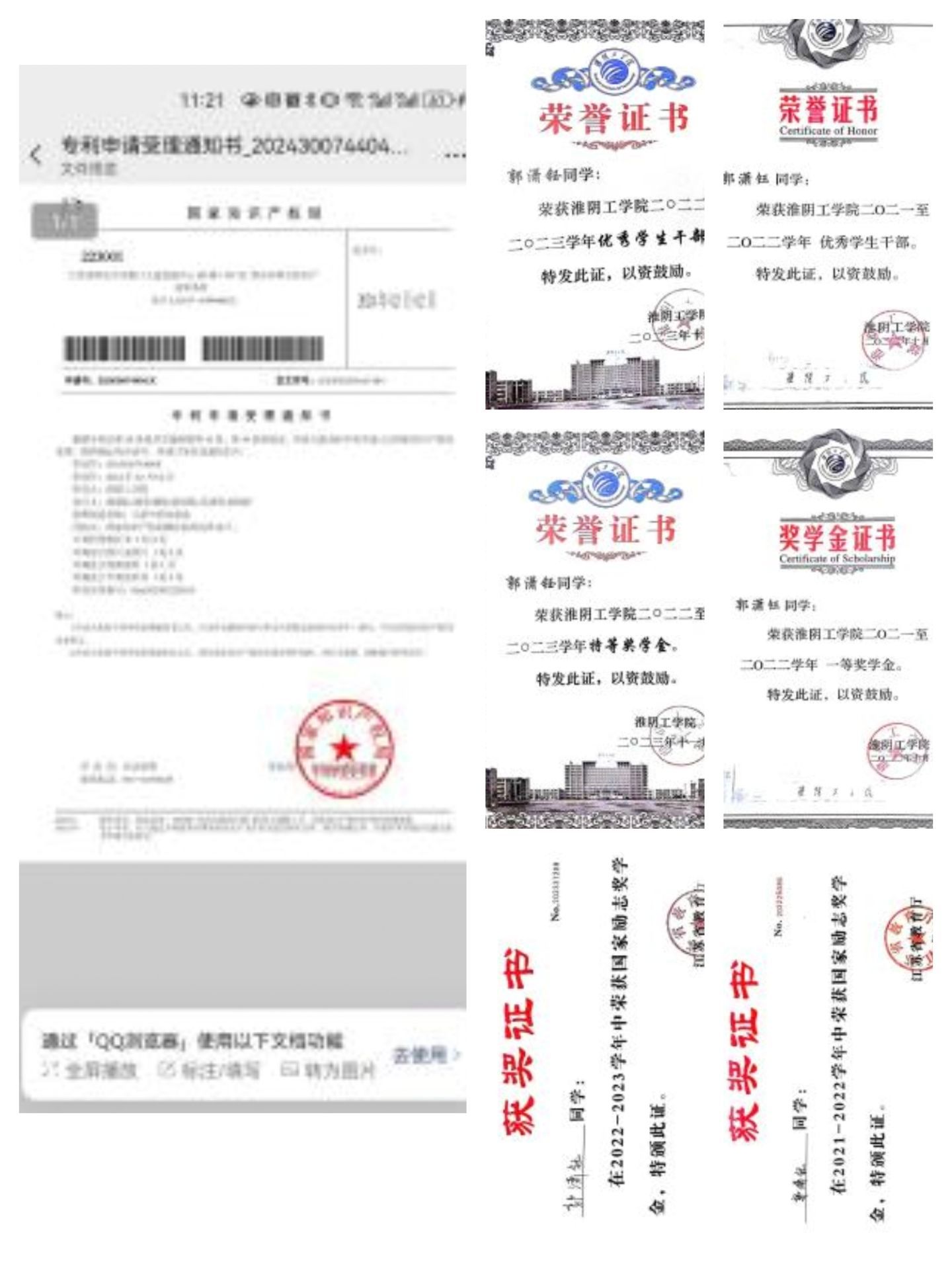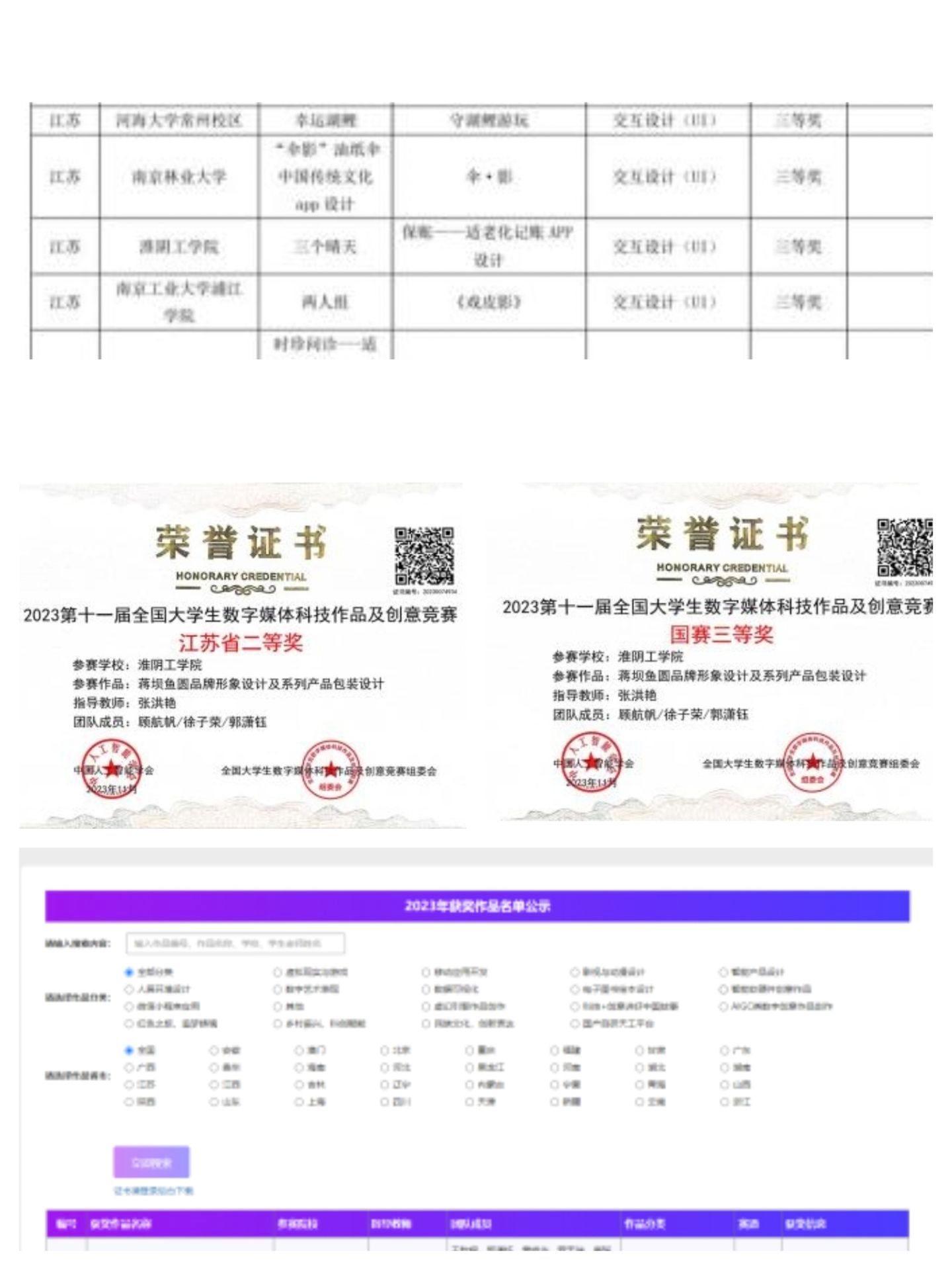 省级:全国老员工数字媒体科技作品及创意竞赛省级二等奖、全国老员工数字媒体科技作品及创意竞赛省级三等奖、蓝桥杯省级三等奖、省级大创项目一项