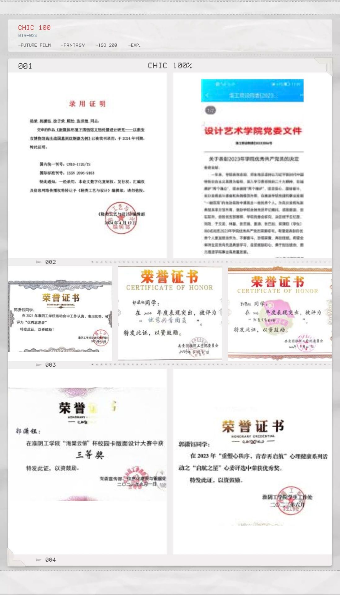 郭潇钰,女,汉族,2003年6月出生,中共预备党员,就读于yd222云顶线路检测设计艺术学院视传1211班,现任yd222云顶线路检测设计艺术学院员工会主席、数媒1232班班主任助理、党务秘书助理等职位。曾获国家励志奖学金两次、省级优秀员工干部一次、校优秀员工干部两次、校特等奖学金、校一等奖学金、校优秀共青团干部一次、校优秀共青团团员一次、校启航之星、院优秀共产党员、院优秀志愿者等奖项,目前省级大创结题一项、发表期刊一篇、发表专利一项。
