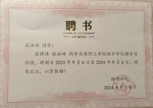 两年前,张涵硕的高考分数并不高,这样的起点并没有让他感到沮丧或满足。相反,他深知,这只是一个新的开始,真正的较量在于过程,而非起点。于是,他怀揣着对知识的渴望和对未来的憧憬,踏上了求学之旅。在课堂上,他总是全神贯注,紧跟老师的思路,积极提问,勇于表达自己的观点。在课下,他更是与同学们热烈讨论,共同探索学术的奥秘。他善于从多个角度思考问题,总能提出独到的见解,深受同学们的喜爱和尊敬。经过不懈的努力,他连续多个学期保持专业排名第一的优异成绩,并且获得校特等奖学金、国家励志奖学金、校三好员工等荣誉,这些奖项不仅是对他学业成绩的肯定,更是激励他未来的道路上继续努力的动力。