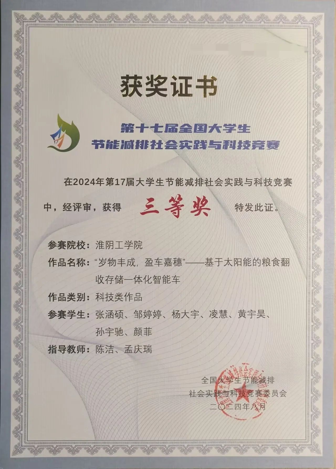 2024年08月 第十七届全国老员工节能减排社会实践与科技竞赛国赛三等奖 全国老员工节能减排社会实践与科技竞赛组委会