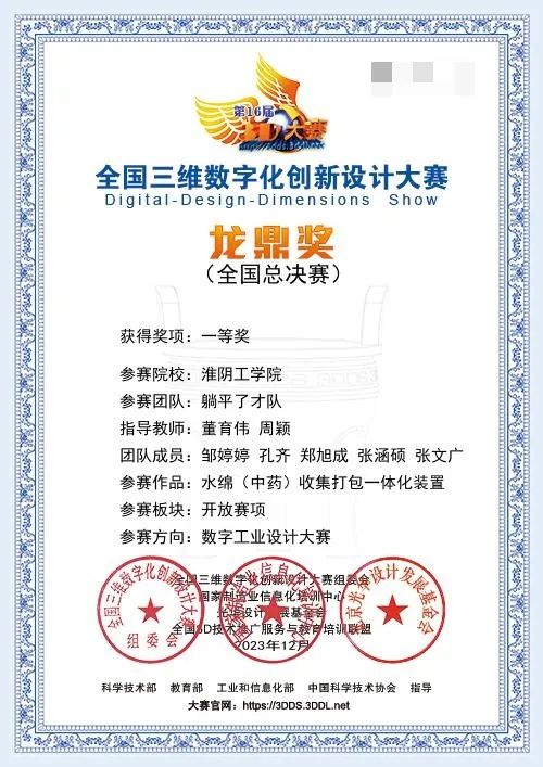 2023年12月 第十六届全国三维数字化创新设计大赛国赛一等奖 全国三维数字化创新设计大赛组委会