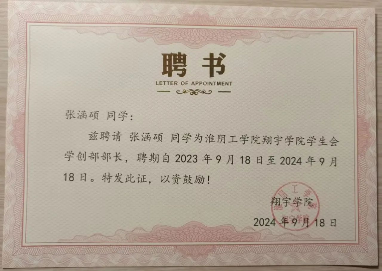 在员工工作方面,张涵硕工作认真负责。在担任班级班长期间,协调管理班级的日常事务,组织班级活动,团结班级同学,增强班级凝聚力,所在班级获得“校先进班集体”荣誉称号。在担任学院辅导员助理等职务期间,尽职尽责,协助老师完成学院各项事务性工作,为同学们提供优质的服务。他善于倾听同学们的心声,及时解决他们的困惑和问题,成为了师生之间的桥梁和纽带。同时,他还积极参与学院的组织建设和活动策划,为学院员工工作的事业发展贡献了自己的智慧和力量。